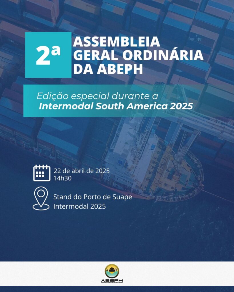 ? A ABEPH realizará sua 2ª Assembleia Geral Ordinária de 2025 durante a Intermodal South America. O encontro será no dia 22 de abril, às 14h30, no stand do Porto de Suape. Em edição especial, a assembleia acontecerá no maior evento de logística da América Latina, reforçando o compromisso institucional da ABEPH com o diálogo e o fortalecimento do setor portuário nacional.
