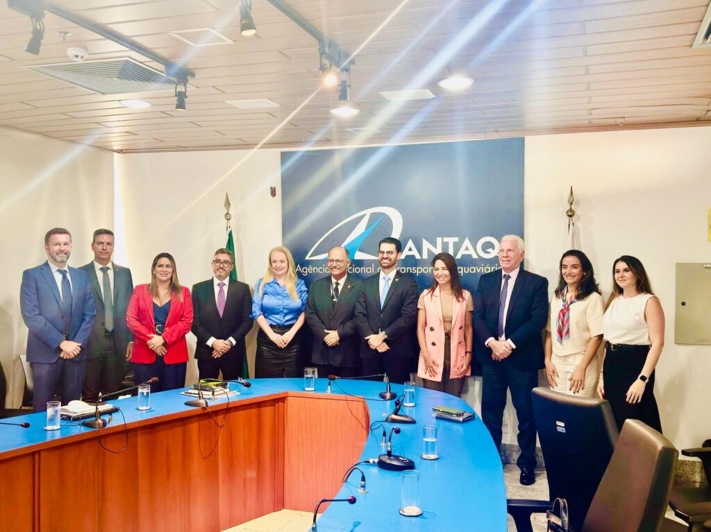 Reforçando seu papel institucional frente à PIANC Brasil, a ABEPH participou, na última quarta-feira (16), de uma reunião na sede da ANTAQ, em Brasília. O encontro foi conduzido pelo Diretor-Geral substituto, Caio Farias, com a presença da diretora Flávia Morais Lopes Takafashi, do diretor Wilson Pereira de Lima Filho e de outros membros da equipe técnica da Agência. Estiveram presentes o presidente da ABEPH e da PIANC Brasil, Luiz Fernando Garcia, e a diretora executiva da ABEPH e secretária executiva da PIANC Brasil, Gilmara Temóteo. A reunião também contou com a participação da equipe jurídica da associação, representada por Beatriz Gallotti e Fábio Silveira. Participaram ainda Claudia Borges, diretora executiva da ABTP, além do diretor-presidente da ATP, Murilo Barbosa, e da coordenadora executiva da entidade, Gabriela Costa. A ABEPH segue dedicada ao fortalecimento da PIANC Brasil e comprometida com o avanço desta importante organização internacional em nosso país.